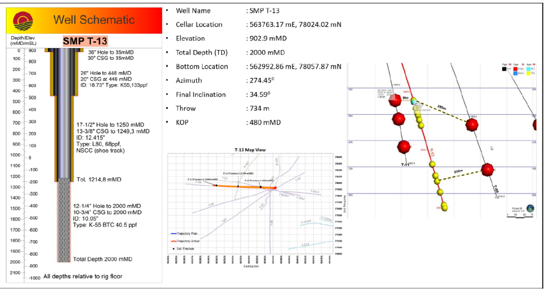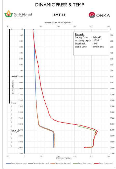 2023年6月7日,SMGP鉆井和資源團隊對耗時27天、于6月6日完井的T-13井進行了完井測試。測試數(shù)據(jù)顯示:T-13是一口高溫、高流動性的生產(chǎn)井,成功打出了因T-11修井失敗而損失的熱源。該井吸水指數(shù)在54.76kg/s/bar到94.12kg/s/bar之間,在停止注水后4.5小時后井下最高溫度即錄得217.9℃。其生產(chǎn)層穩(wěn)定在300℃的情況下,該井預計可生產(chǎn)190噸/小時的高壓蒸汽。