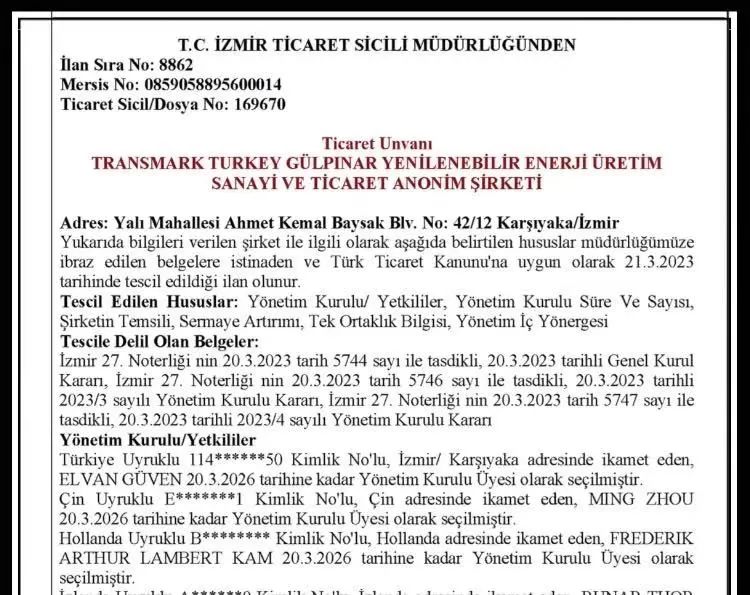 近日,開山集團股份有限公司的全資公司OME (Eurasia) Pte., Ltd.(以下簡稱“OME Eurasia”)與Sonsuz Enerji Holing B.V.(以下簡稱“Sonsuz”)已在伊茲密爾完成Transmark turkey Gulpinar Yenilenebilir Enerji Urtetim Sanayi(以下簡稱“TTG”)公司的股權變更手續(xù),完成了OME Eurasia與Sonsuz此前簽署的《TTG公司股權認購暨股東協(xié)議》所規(guī)定的交割程序。TTG新股東結構及董事會成員已在土耳其工商機構進行登報。至此OME Eurasia已成為擁有TTG49%股份的股東,Sonsuz控股51%。